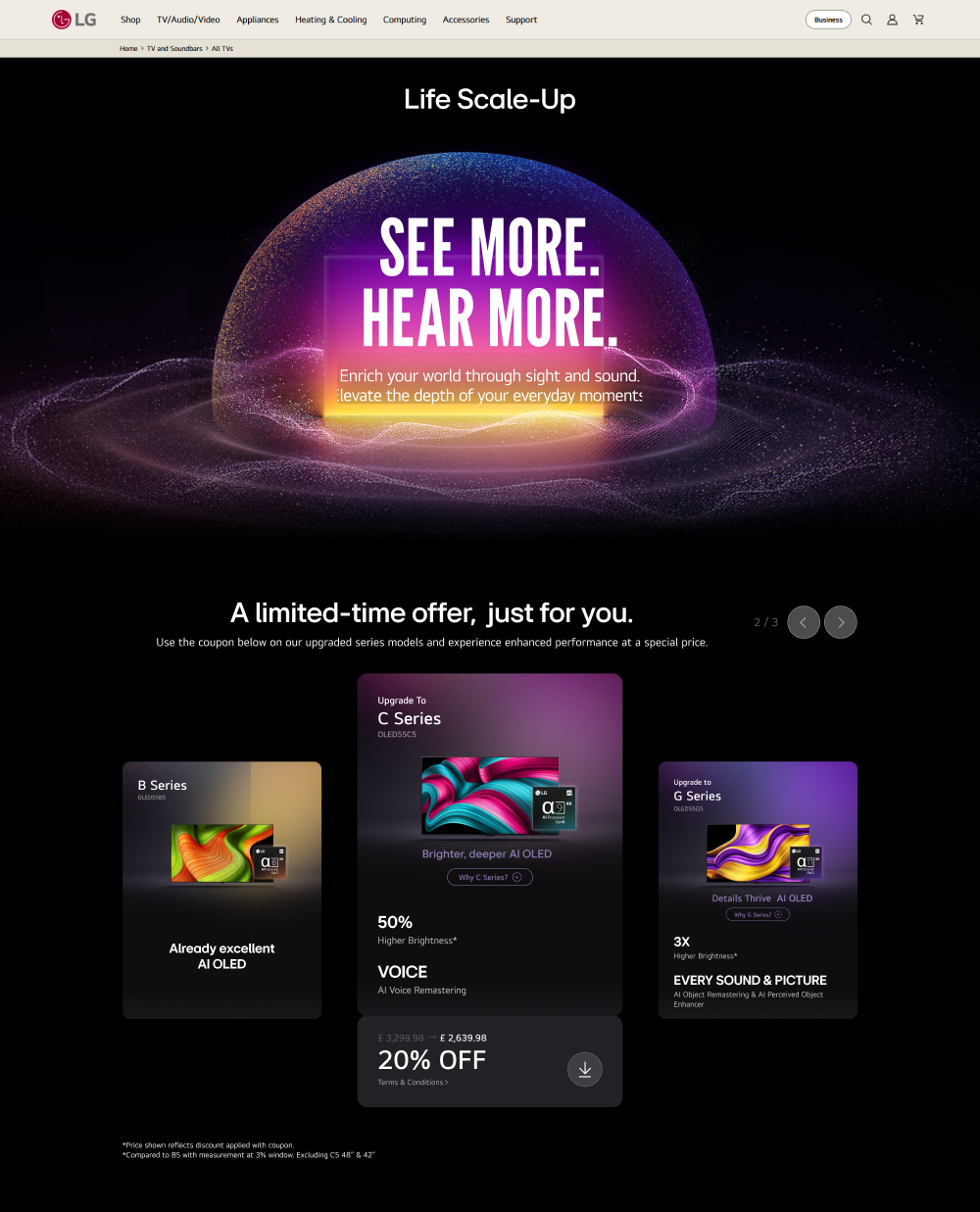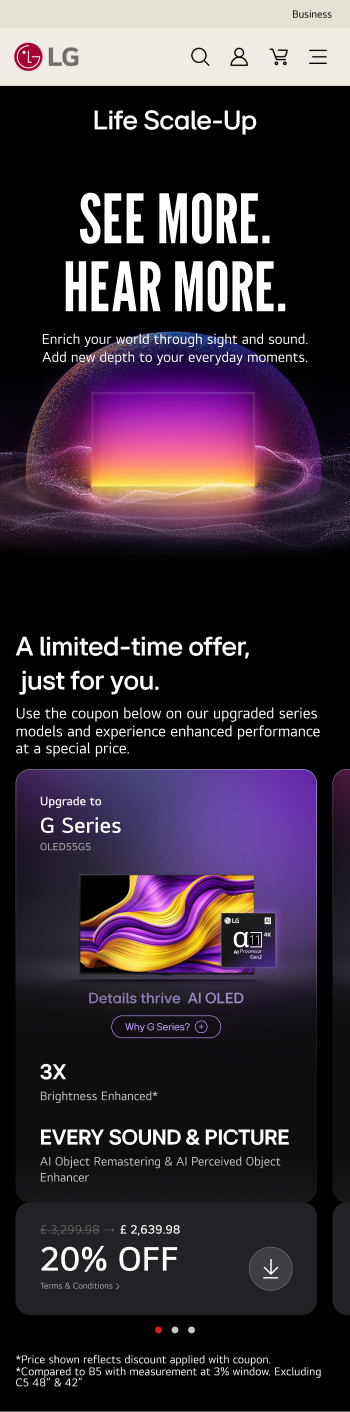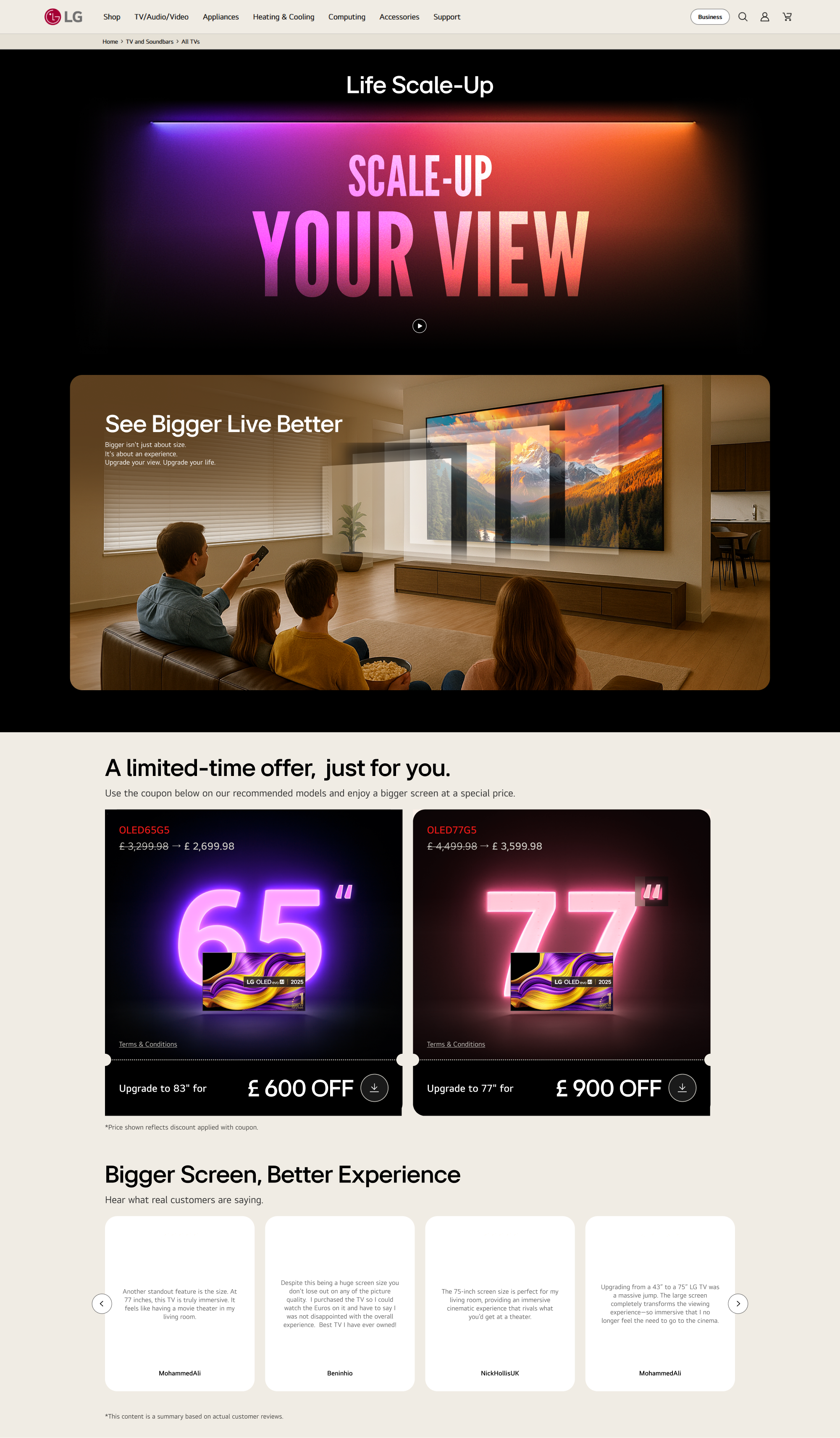 OLED TV의 업그레이드를 화면 크기나 스펙이 아닌 경험의 확장으로 해석한 비주얼 컨셉.개인화 타겟팅된 배너 클릭 시, 고객이 탐색하던 맥락을 이어받은 업셀 전용 랜딩 페이지로 연결됩니다.