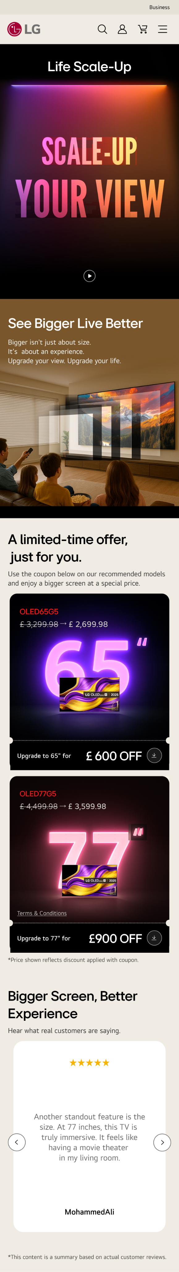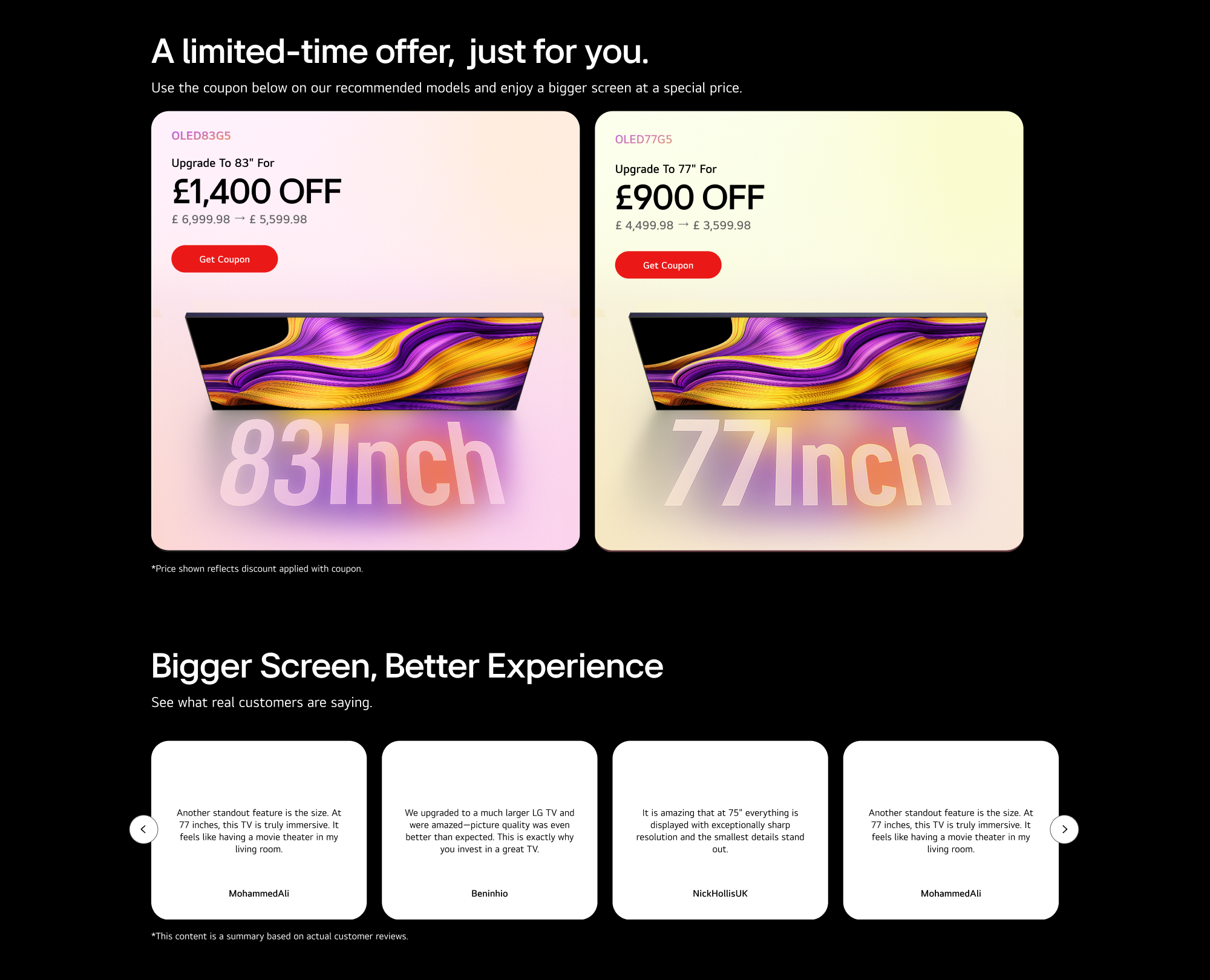 서로 다른 인치의 OLED TV를 2회 이상 탐색한 고객에게 인치 업그레이드 개인화 배너 + 쿠폰 노출