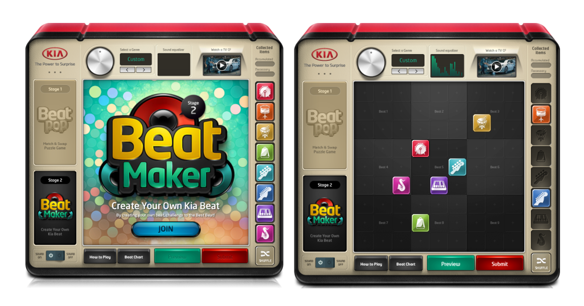 자동차 부품을 타악기처럼 타격하여 음악을 만드는 기아차 기업PR광고의 breand e quity를 승계하는 온라인 캠페인을 페이스북 어플리케이션을 활용하여 제작. 3개 이상의 자동차 블록을 가로 또는 세로의 일렬로 정렬시켜가며 특정 점수에 도달할 때마다 악기 아이템을 획득하게 되며(BeatPop), 앞에서 획득한 악기들을 가지고 나만의 Beat를 작곡하여 페이스북 User들의 Vote를 통해 Chart에서 경쟁하는 게임.