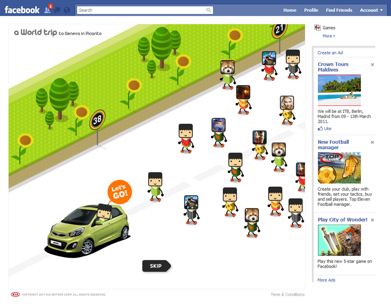 기아자동차가 스위스 제네바 모터쇼 참가를 기념으로 유럽 13개국을 대상으로 진행한 페이스북 캠페인.
