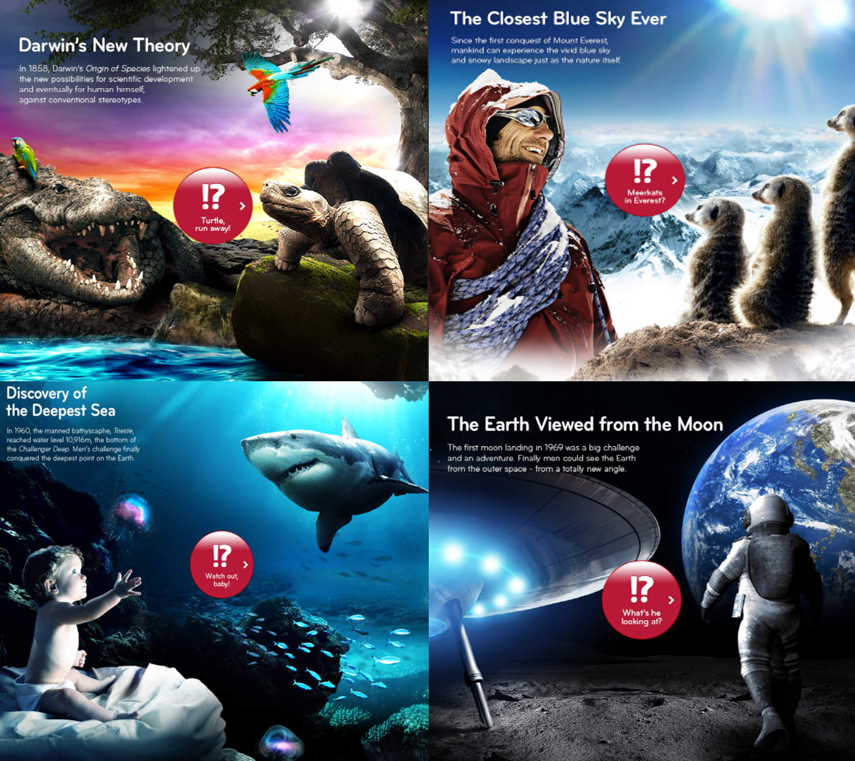 페럴렉스 방식을 적용하여 화면의 오브젝트가 움직여 입체감을 부여했고최초의 逆 종스크롤을 적용하여 사용자들의 신선한 반응을 이끌어냈다.